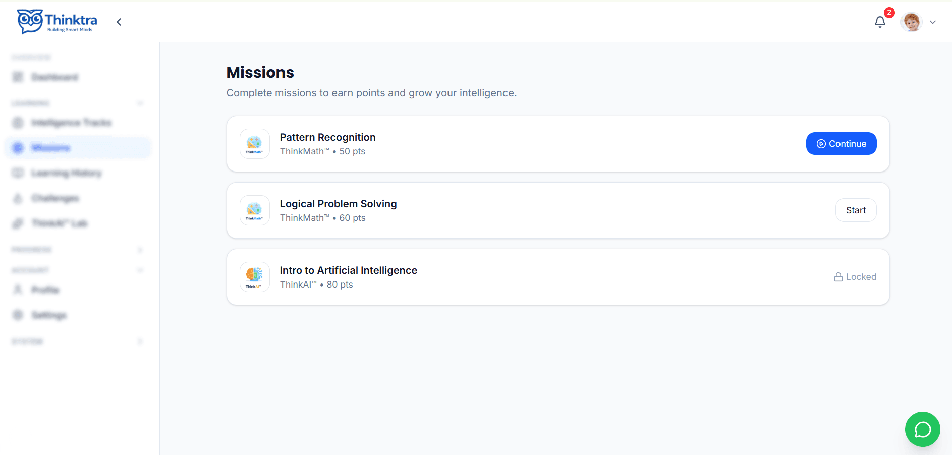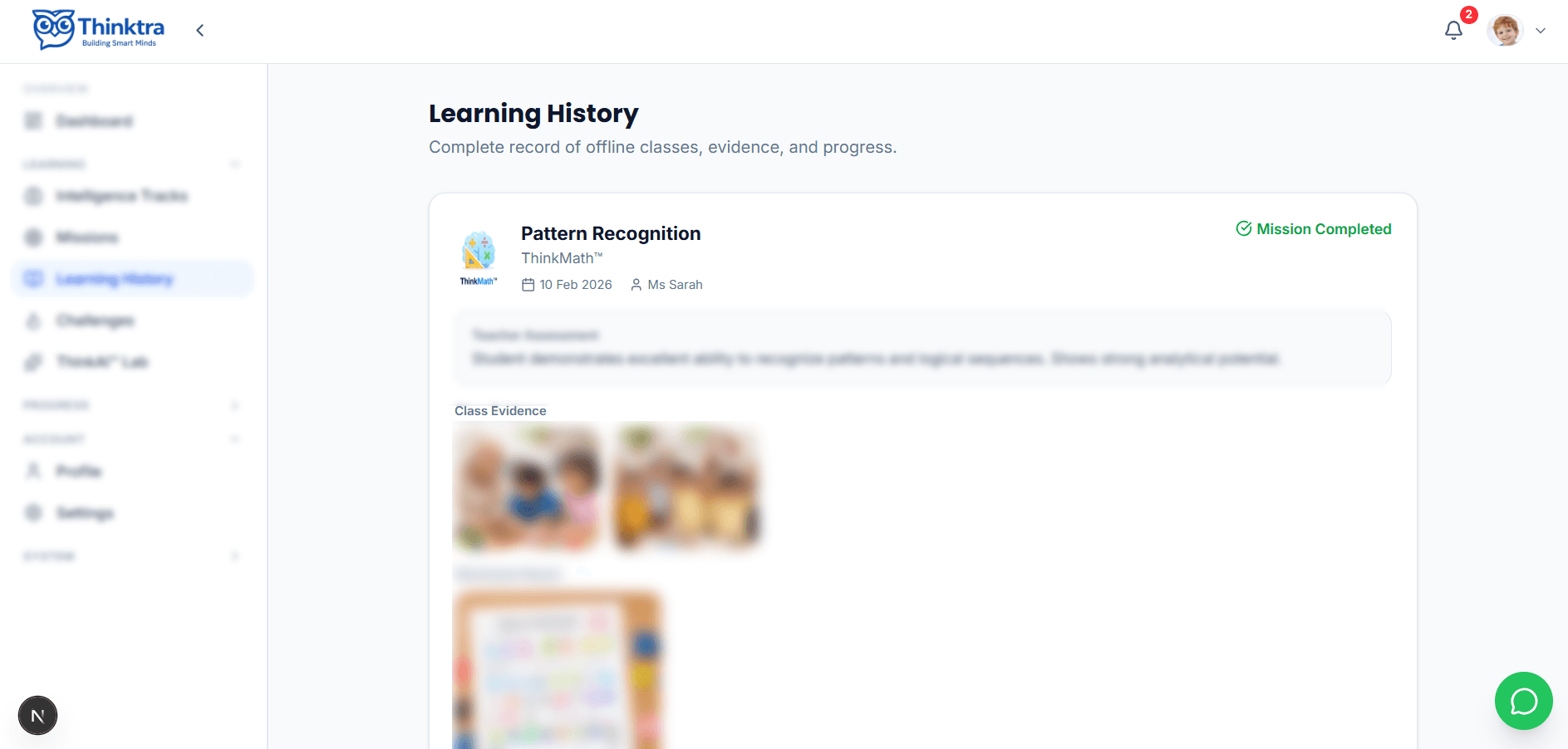Dashboard Thinktra membantu orang tua melihat progres anak, sesi belajar yang telah selesai, dan perkembangan keterampilan berpikir dalam satu tampilan yang ringkas.